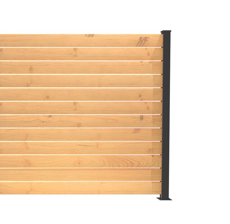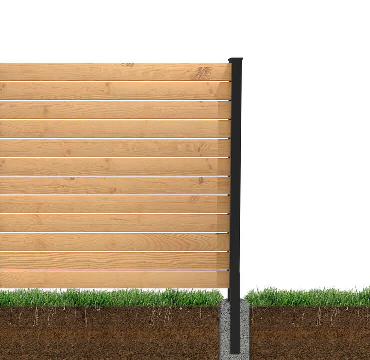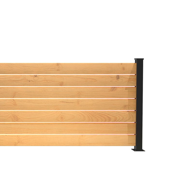 HOFT KIT A4 includes one black powder-coated aluminum end post and all necessary hardware to create your privacy screens and fences. Our fast and easy slide installation system is a sturdy no nail assembly. Simply choose your preferred wood or composite planks and slide them in.