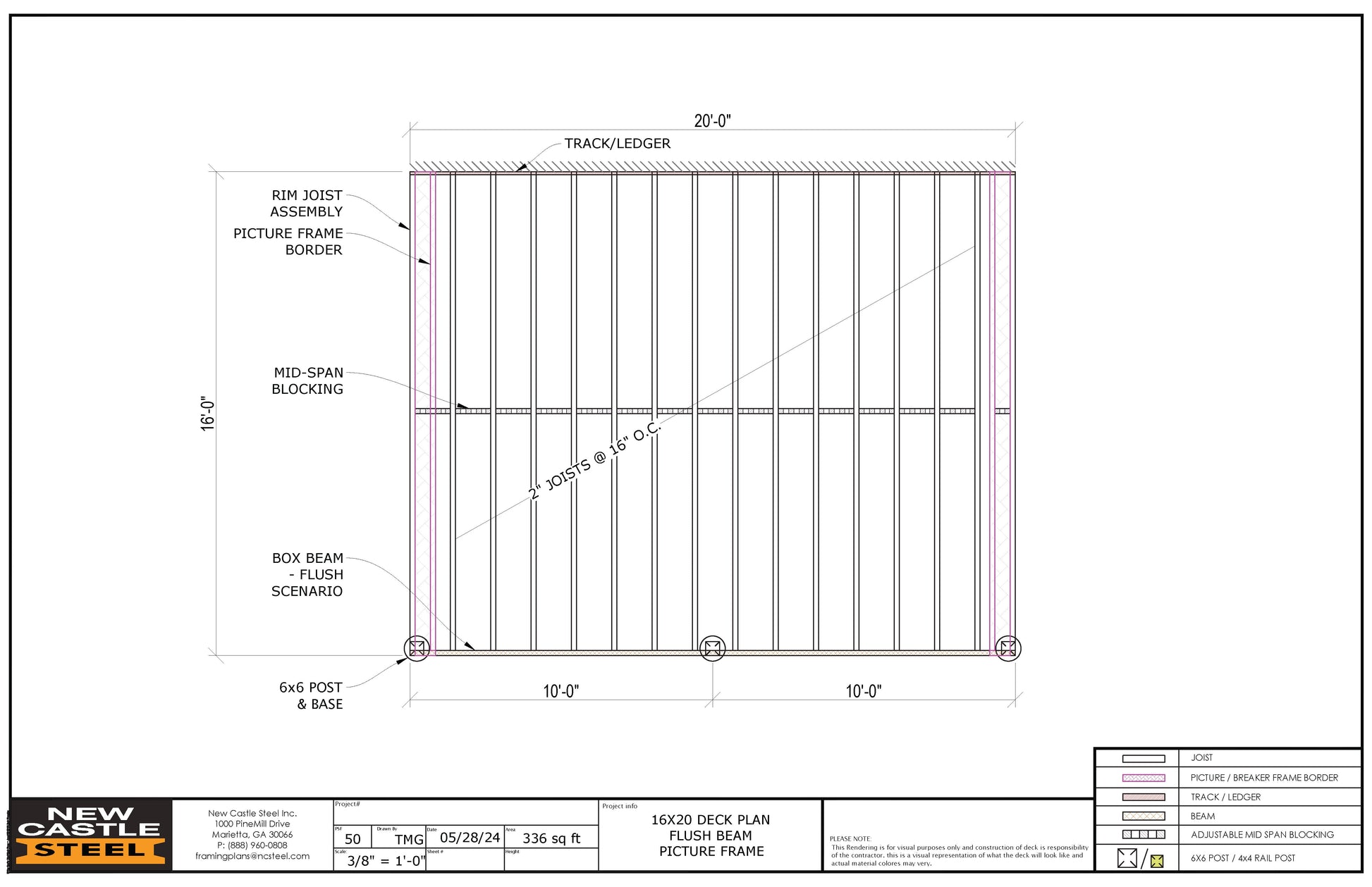 New Castle Steel Deck Framing Kit - 16x20 Deck, Flush Beam, Picture Frame