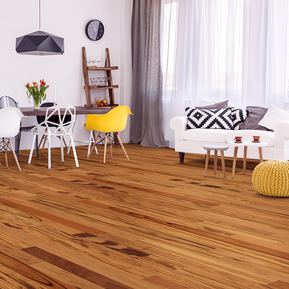 Brazilian Koa/Tigerwood solid flooring offers a combination of exotic aesthetics, exceptional hardness, durability, stability, and natural resistance to decay. Its unique color variation, long lifespan, high density, and distinctive grain patterns make it a great choice for any flooring project. Additionally, purchasing directly from a company-owned factory allows for cost savings and ensures a quality product. Whether it's for residential or commercial use, Brazilian Koa/Tigerwood flooring provides a visually striking and reliable flooring solution that can enhance the overall ambiance of your space.
