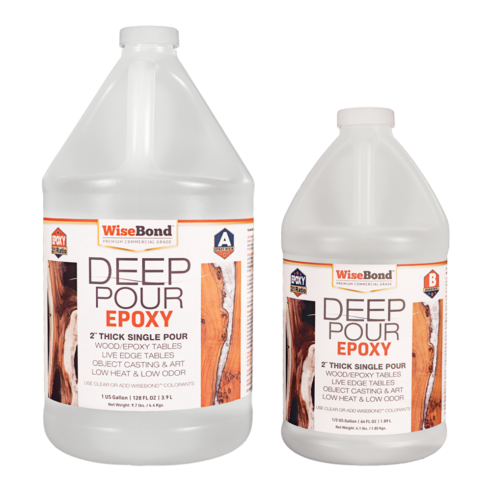 WiseBond™ Deep Pour Epoxy kit includes a resin (Part A) and a hardener (Part B). Deep Pour Epoxy 1.5-Gallon Kit includes 1-gallon of resin and 1/2-gallon of hardener.